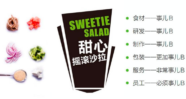 這款自稱最有逼格的甜心搖滾沙拉,秉承著矯情事兒B的精神打造極致產(chǎn)品,在沙拉的打造上也是采用進口的水果蔬菜,立志為更多的吃貨和繁忙的都市白領(lǐng)打造“矯情”的健康精致生活,由上可見他們在產(chǎn)品宣傳上一慣耳目一新的詞語很是吸引年輕人,這使得他們迅速在競爭激烈的飲食圈站穩(wěn)了腳跟。