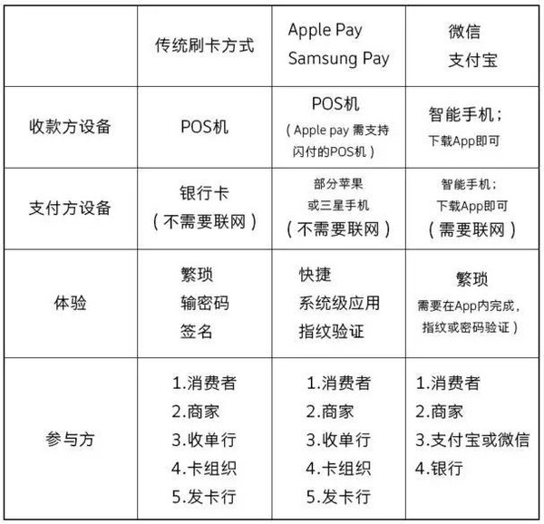 除了設備,網絡和體驗上的差別,Pay 們和支付寶微信的最本質差別就是付款流程和參與方。