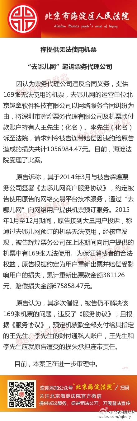 去哪兒方面稱,深圳市輝煌票務代理有限公司(以下簡稱“輝煌票務”)違反協議約定,向用戶提供169張無法使用的機票,導致其收到用戶大量投訴。因此,去哪兒經營者將“輝煌票務”訴至法院,要求票務代理公司及機票款付款賬戶持有人連帶賠償損失105萬余元。