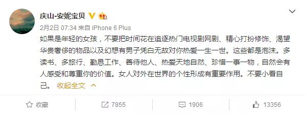 就拿居于榜首的安妮寶貝為例。作為網(wǎng)紅1.0時(shí)代的領(lǐng)頭人,早期的安妮寶貝討年輕人喜歡——糜爛的愛(ài)情、人生的孤獨(dú)感之類的話題很容易引發(fā)共鳴,加之文字不錯(cuò),紅得有道理。從她現(xiàn)在的微博來(lái)看,大多數(shù)內(nèi)容還是些發(fā)人深省的文字,旨在用自身的文學(xué)造詣吸引粉絲,基本上不以廣告作為收入來(lái)源。
