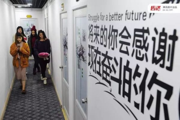 圖為2015年12月7日,安徽阜陽(yáng)幾名網(wǎng)絡(luò)女主播上班時(shí)經(jīng)過(guò)狹窄的走廊