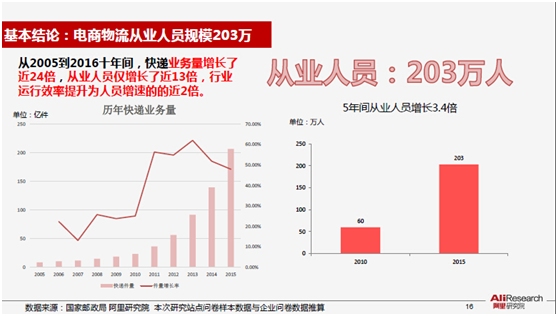 根據從業者報告的數據,截至2016年初,全國社會化電商物流從業人員達到203.3萬人。此前《快遞服務“十二五”規劃》顯示,截至2010年快遞從業人員達到60萬以上,5年間從業人員上漲約3.4倍。