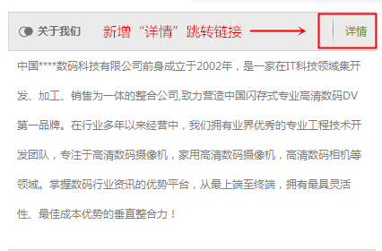 該模塊新增“詳情”跳轉(zhuǎn)鏈接,便于用戶點(diǎn)擊,瀏覽關(guān)于企業(yè)的更多品牌介紹。商家可在后臺(tái)點(diǎn)擊“自定義頁(yè)面”,進(jìn)入“關(guān)于我們”,自主添加企業(yè)介紹(包括顯示在主頁(yè)面的簡(jiǎn)短描述,以及二級(jí)頁(yè)面的詳情介紹)。