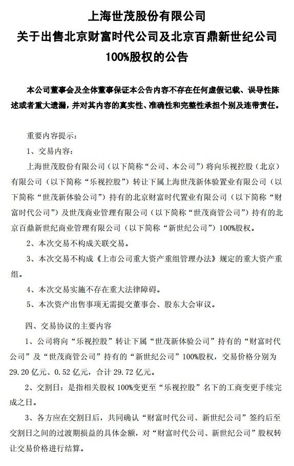 今日晚間,上海世茂股份有限公司發布公告稱,公司將向樂視控股(北京)有限公司轉讓下屬世茂新體驗公司持有的北京財富時代置業有限公司,以及世茂商管公司持有的北京百鼎新世紀商業管理有限公司100%股權,交易價格分別為29.20億元和0.52億元,合計29.72億元。