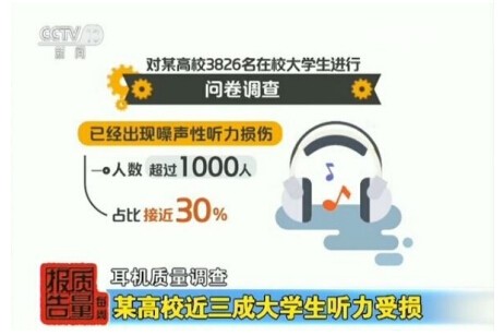 近日,央視《每周質量報告》節目在關于《耳機質量調查》的專題中, 對某高校3826名在校大學生進行調查發現,耳機使用率高達99.8%,出現聽力損傷人數超過1000人,近30%的大學生的聽力受損,觸目驚心!