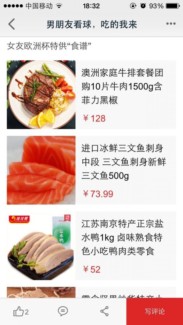 比如針對歐洲杯的“男朋友看球,吃的我來”,點進去之后就會看到一些簡單的文字介紹和食譜,有三文魚、牛排等,上面標注了價格,點擊圖片或者文字,就能跳轉到相應的購買頁面。還有針對畢業季賣旅行相機、父親節潮爸清單的帖子。