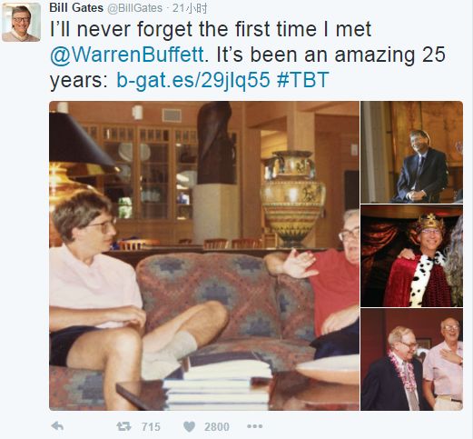 隨后蓋茨在Twitter上放出兩人青澀舊照,還特地撰寫長文《25年的學習與笑聲》(25 Years of Learning and Laughter),記錄他與巴菲特25年友情的點點滴滴。他說“我不記得與我大多數(shù)朋友第一次見面的時間,但我卻記得與巴菲特的,那就是25年前的今天:1991年7月5日。”