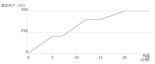 既然是容量探測,所以整體的施壓過程是一個梯度漸進的過程,一般不會上來就是一條直線。這是一直和用戶強調的問題,壓測的目的絕對不是把系統壓垮,壓測的目的是通過不斷增加的并發來客觀評估系統在不同的壓力條件下的性能狀況;基于此我們定制了施壓的梯度壓力模式,如圖所示: