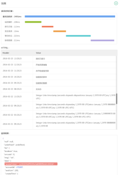 基于請求的深入分析,在壓測寶中提供問題請求的詳細快照,包括請求的響應時間分解、請求頭和返回結果,如下圖所示。