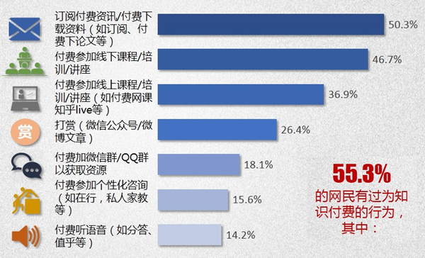線上課程是除了付費(fèi)下載外,用戶接受程度最高的模式:消費(fèi)有償分享的知識(shí)的滲透率在網(wǎng)民中超過了一半,達(dá)55.3%,仍然有很大的提升空間。在有過知識(shí)付費(fèi)行為的人中,訂閱付費(fèi)資訊/付費(fèi)下載資料的人占比最高,付費(fèi)參加線下課程/培訓(xùn)/講座滲透率其次,接下來是為線上課程/培訓(xùn)/講座付費(fèi)(37%)。個(gè)性化咨詢和付費(fèi)聽語音的滲透率最低。