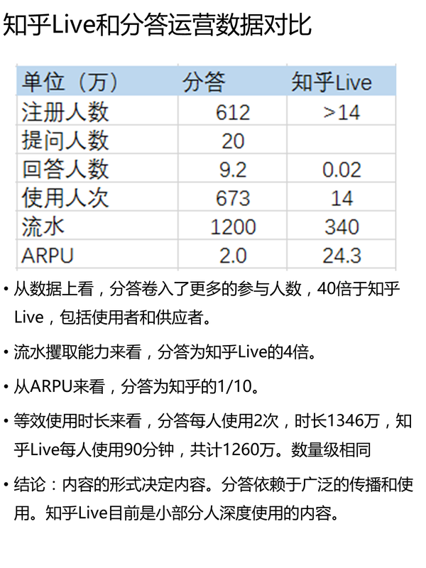 知乎Live目前的流水增速,遠(yuǎn)低于分答。按每年1800萬計(jì)算,按知乎估值18億rmb計(jì)算,知乎Live提成10%,則Price/earning=1000。