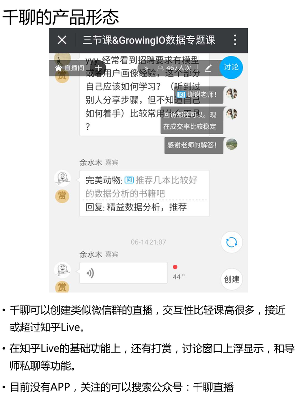 工具化的競(jìng)品已經(jīng)有一些,千聊,紅點(diǎn)。千聊和知乎Live的上課場(chǎng)景形態(tài)極為類似。