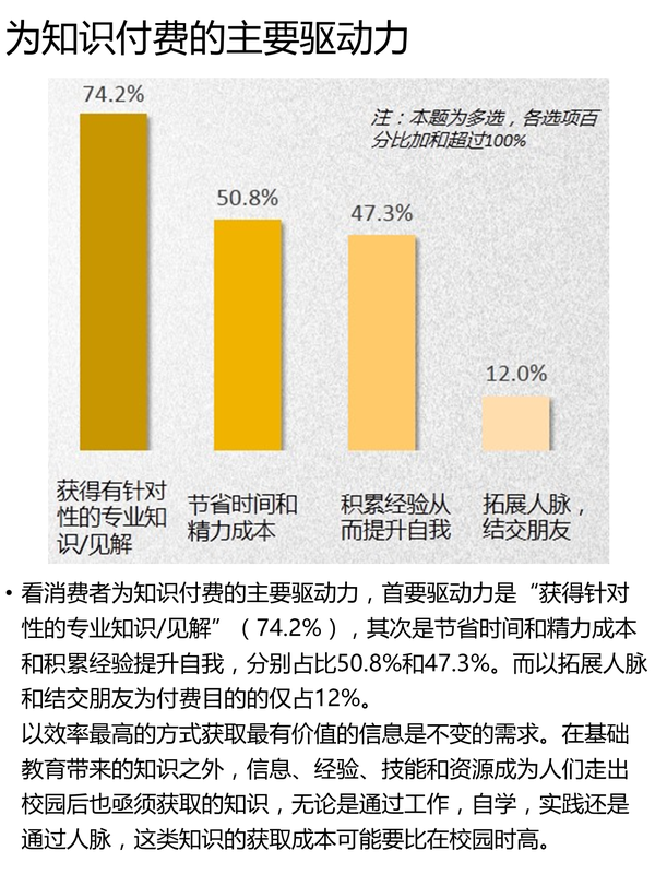 從上圖來看,專業(yè)性,高效和自我提升,是促使知識(shí)付費(fèi)的主要驅(qū)動(dòng)力。