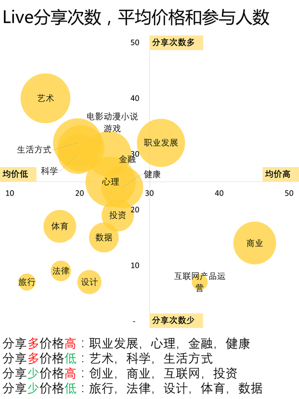 另一方面,目前知乎Live的形式?jīng)Q定在非娛樂專業(yè)領(lǐng)域(數(shù)據(jù),法律,創(chuàng)業(yè),互聯(lián)網(wǎng),設(shè)計(jì)等專業(yè)領(lǐng)域)的分享次數(shù)和參與人數(shù)都較少。和職業(yè)發(fā)展和商業(yè)不同(這兩個(gè)領(lǐng)域更偏向于經(jīng)驗(yàn)和方向指引),這些領(lǐng)域需要知識(shí)鋪墊(同時(shí)專業(yè)術(shù)語較多),和日常生活離的較遠(yuǎn)(工具型較強(qiáng),結(jié)果導(dǎo)向),分享者應(yīng)該考慮如何降低參與門檻,以趣味性和相關(guān)性更強(qiáng)的角度引入話題。