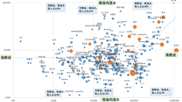 知乎大V的分享次數(shù),具體來看為下圖,橫軸為粉絲數(shù)量,縱軸為場(chǎng)均收入。圓圈大小代表分享次數(shù),分享大于3的用橙色圈出來。(平均每位大V分享1.8次。)
