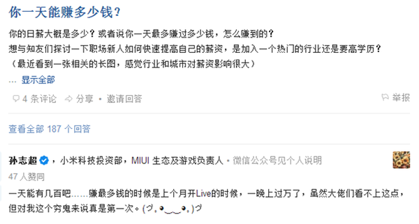 這里引用一個(gè)我關(guān)注大V的調(diào)侃言論:雖說是調(diào)侃,但是過萬收益還是很impressive的。起碼,知乎讓人直接通過知識(shí)分享賺到錢了,而不是辛辛苦苦寫公眾號(hào)廣告轉(zhuǎn)化,賣東西等等。