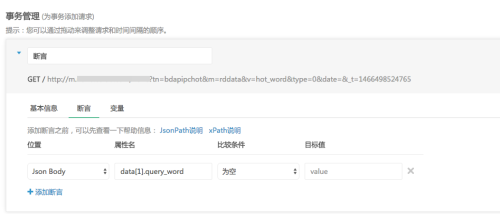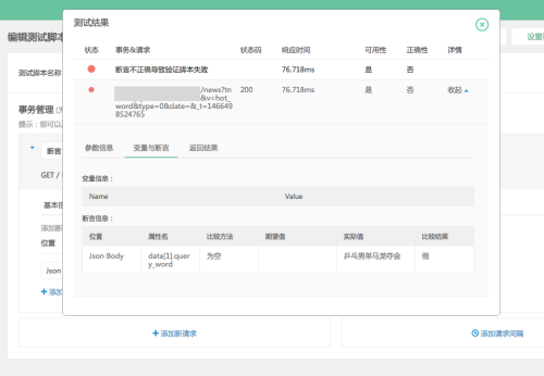 [5]支持接口正確性判斷除了需要對接口的響應時間和可用性進行判斷之外,還需要對事務或者接口的正確率進行驗證,這里的正確率是指一段時間內,事務正確次數(shù)占事務總次數(shù)的百分比,即事務正確次數(shù)/事務總次數(shù)。事務正確:事務的所有請求都正確才為正確。請求正確:API接口斷言正確則請求正確。在大量并發(fā)的情況下,有時候系統(tǒng)會出現(xiàn)“臟數(shù)據(jù)、錯誤數(shù)據(jù)”的情況——雖然接口可用,但是其返回結果并不是預期的值,所以在壓測的時候有必要對接口返回結果進行檢測,如下圖所示,通過壓測寶腳本配置,可以很方便地進行斷言匹配設定與腳本驗證: