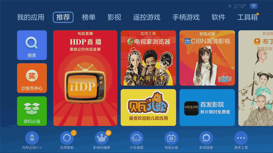 4. 打開沙發(fā)管家電視應(yīng)用市場,下載小薇直播、HDP直播等應(yīng)用看直播;安裝影視搜搜、騰訊視頻TV等應(yīng)用免費看電視、電影和綜藝節(jié)目。