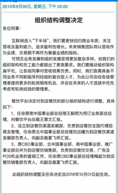 今年下半年以來,“新美大”一系列的做法和表態反襯出其在如今市場中的焦慮和不安:今年7月,王興內部講話表示公司發展將進入“下半場”,并坦承“回顧之前我們的發展,基本還是“上半場模式”,就是猛抓用戶、猛接商戶,然后做“營銷交易”這比較薄的一層”,在9月30日,新美大又在內部郵件中表示“銷售團隊將以營收作為業績,交易額不再作為衡量指標”。