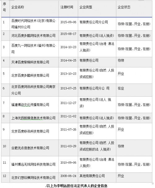 據《財經》記者了解,李明遠自2008年6月首次在北京幻想縱橫網絡技術有限公司擔任法定代表人,2010-2015年接連在11家公司中擔任法定代表人,如河北百度多酷網絡技術有限公司、天津百度紫桐科技有限公司、北京百度多酷科技有限公司等等。但上述含有“百度”字眼的公司在股權關系上均與百度無任何關聯,上述公司基本都涉足游戲行業,并同時參股多家游戲公司。