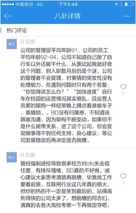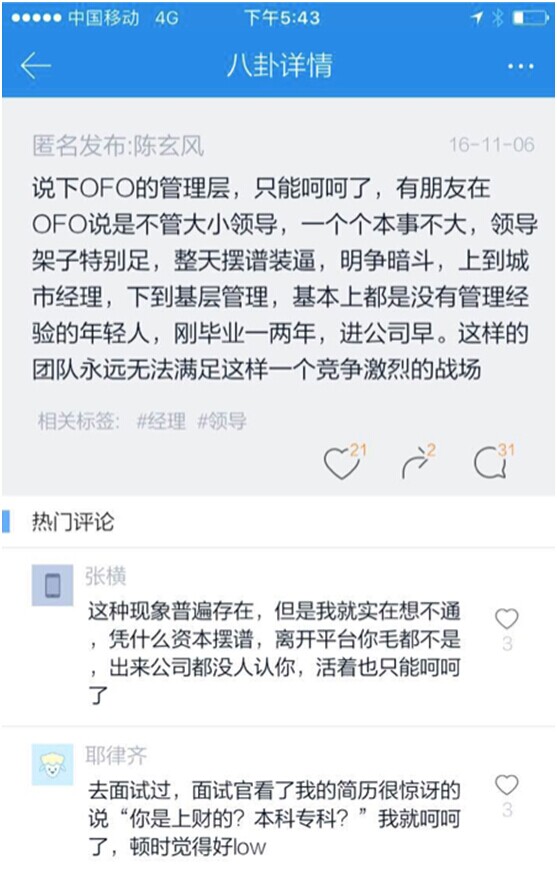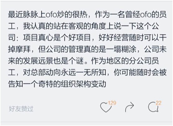 最近,脈脈上傳來(lái)不少OFO內(nèi)部知情人士的消息:大意是說(shuō)OFO的團(tuán)隊(duì)管理不善,內(nèi)部架構(gòu)一塌糊涂之類的,有圖有真相。