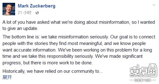 扎克伯格指出,Facebook現正在展開的一些項目都將能夠起到標示出假新聞、協助讀者上報假消息、更優文章推薦等作用。另外,他還指出,Facebook還將跟記者以及一些事實核查組織展開合作并從中獲取消息真實性認證的經驗。