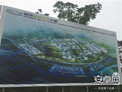 十字路口另一側(cè),豎立著三塊巨大的項(xiàng)目展板,其中一塊名為“德清智慧汽車小鎮(zhèn)”。在這塊展示板上,印著高新區(qū)的布局,包括智慧汽車制造整車工廠和智慧物流港等內(nèi)容。
