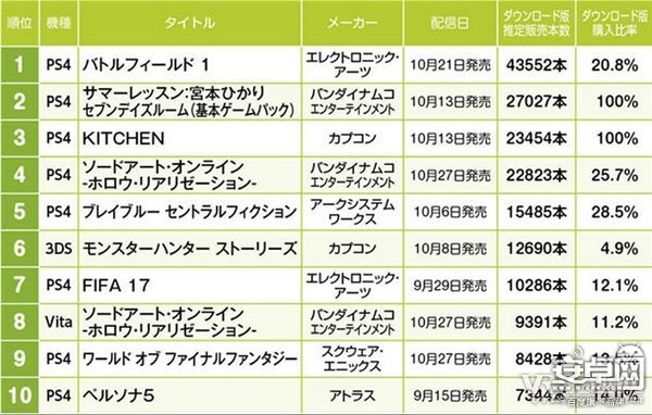 夏日課堂》做為數字版游戲擊敗了那些擁有實體發售的游戲,最令人震驚的是它竟然超過了卡普空的生化危機7》“廚房”Demo,那個Demo僅售100日元(約6RMB)。 下面是10月排行榜前十名: 戰地1–PS4–43,552 夏...