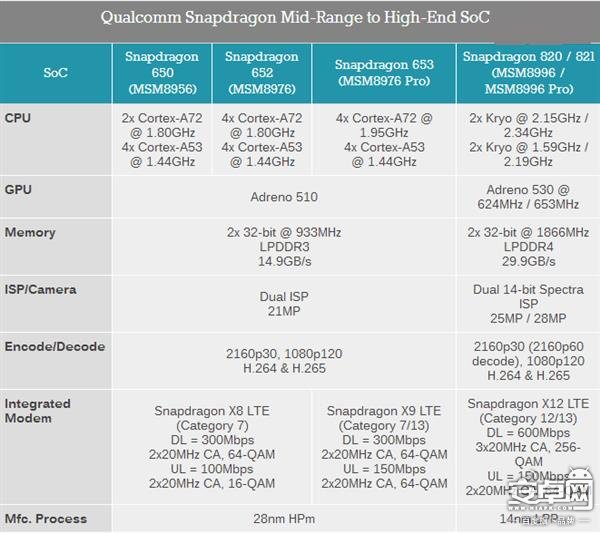驍龍653:代號MSM8976 Pro,采用4核A72 4核A53設(shè)計(jì),大核頻率從652的1.8GHz提升到了1.95GHz,GPU依然采用了Adreno 510,綜合性能提升了10%左右。內(nèi)存支持的容量從6GB提高到8GB。基帶升級到了LTE X9,上傳速率從100Mbps提升到150Mbps,支持QC3.0快充。