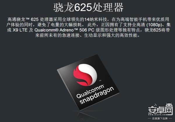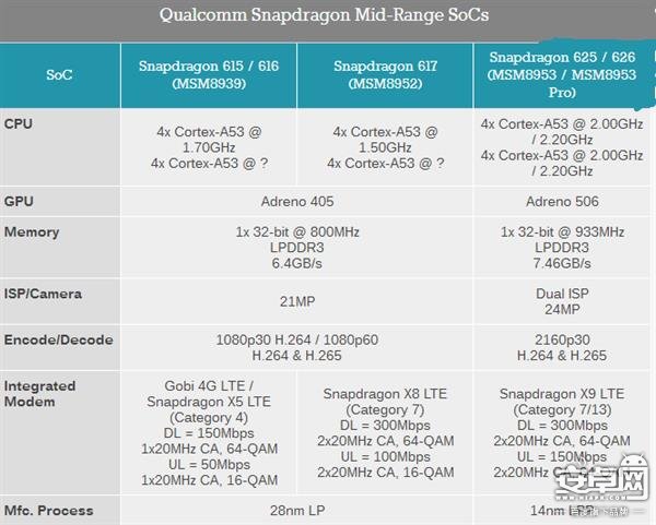 驍龍626:代號MSM8953 Pro,也就是625的升級版,主頻從2GHz提升到2.2GHz,基帶升級為LTE X9,支持藍(lán)牙4.2,其他參數(shù)基本一致,采用14nm制程,支持QC3.0快充。
