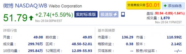 微博(NASDAQ: WB)周一收盤股價上漲2.74美元,至51.79美元,漲幅達5.59%。微博市值達到110.59億美元。
