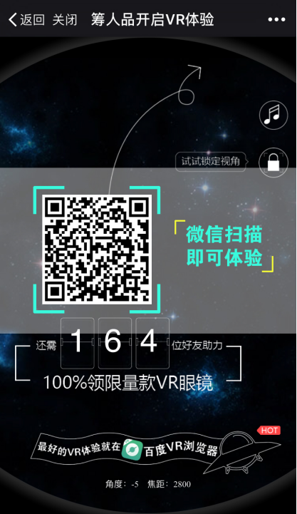 當(dāng)不少人聽見“要邀請(qǐng)169個(gè)微信好友才能獲得VR眼鏡”這個(gè)規(guī)則之后,不少人覺得門檻高、很難實(shí)現(xiàn),但是百度VR瀏覽器此次推出的“籌人品開啟VR體驗(yàn)”的H5活動(dòng),卻打破了這個(gè)認(rèn)知。