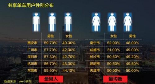 有意思的是,這20個大中城市中,共享單車使用者的性別比例存在比較大的差異。總體來看,女性群體在ofo用戶中的比例占到了45%左右,較之其他品牌要更高一些。