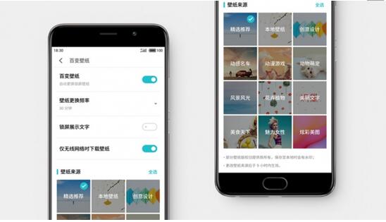 最新Flyme 6體驗版中主題美化新增「百變壁紙」功能,系統會根據設定的壁紙更換頻率,自動更換不同類型的在線或本地壁紙。用戶只需在「主題美化—我的—百變壁紙」打開開關,選擇「壁紙更換頻率」時間間隔,比如每次亮屏的時候自動更換壁紙,或者 30 分鐘后自動切換,即可實現壁紙自動更新。