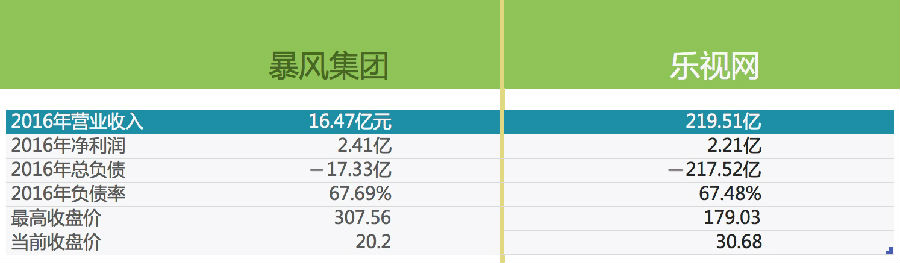 據choice數據顯示,截止到2016年年底,暴風集團和樂視網的總負債分別為17.33億元、217.52億元,負債率分別為67.69%、67.48%。雖然樂視的負債高于暴風200億元,但暴風集團顯示出的種種不利境況也不容忽視。