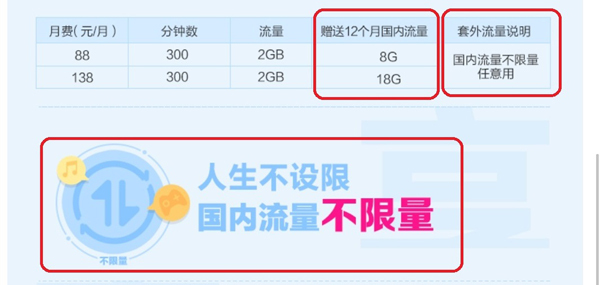 中國移動某地的“任我用”88元全國不限量套餐說明則更復雜,分布于不同界面。詳情頁顯示,套餐內流量只有2G、另外贈送12個月8G國內流量,套外流量卻強調“國內流量不限量任意用”。