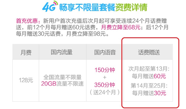 例如,中國移動某地推出優惠價為68元的不限量套餐,其原價為128元,新用戶充值后月費降幅最高達60元,12個月后降幅達30元,24個月后恢復原價。
