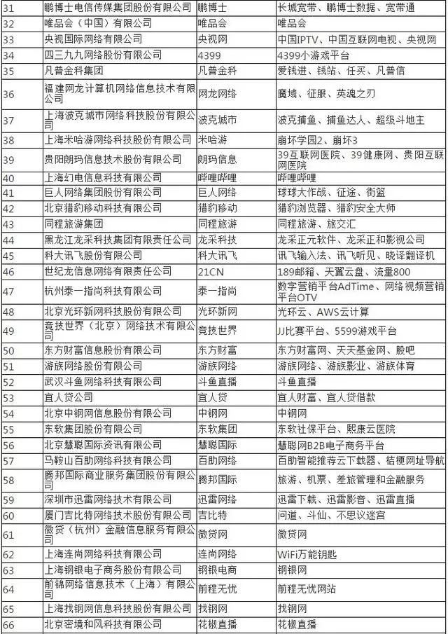 入圍前十的企業分別是:阿里巴巴集團、深圳市騰訊計算機系統有限公司、百度公司、京東集團、網易集團、新浪公司、搜狐公司、美團點評集團、三六零科技有限公司、小米集團。