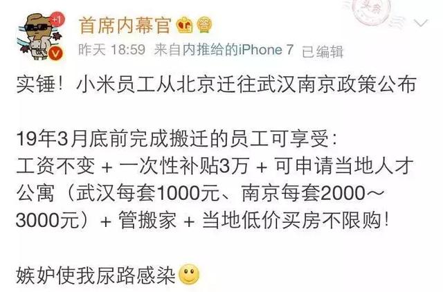10月12日,網曝小米員工從北京遷往武漢、南京的政策,在2019年3月31日前完成搬遷的員工可享受3萬元搬遷福利費,可申請一套當地人才公寓。