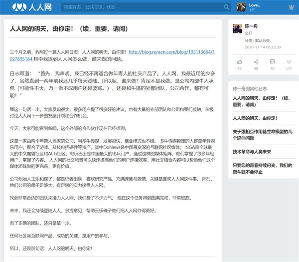 陳一舟還稱,找到非常合適的團隊來接力人人網,費了不少力氣。 現在這個任務得到圓滿完成,非常欣慰。自己會持續登陸人人,多提意見,幫助把人人網辦得更好。