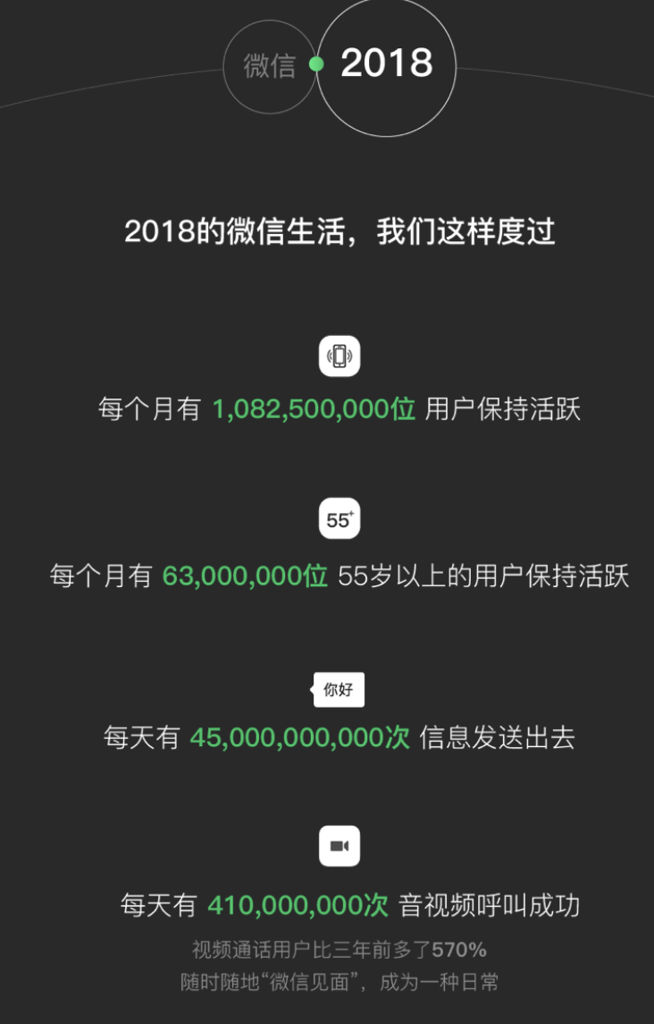 1月9日,在一年一度的微信公開課PRO上,騰訊發布了《2018微信數據報告》。據統計,截至2018年9月,微信的月活用戶數約為10.8億,其中55歲以上月活用戶約為6300萬。