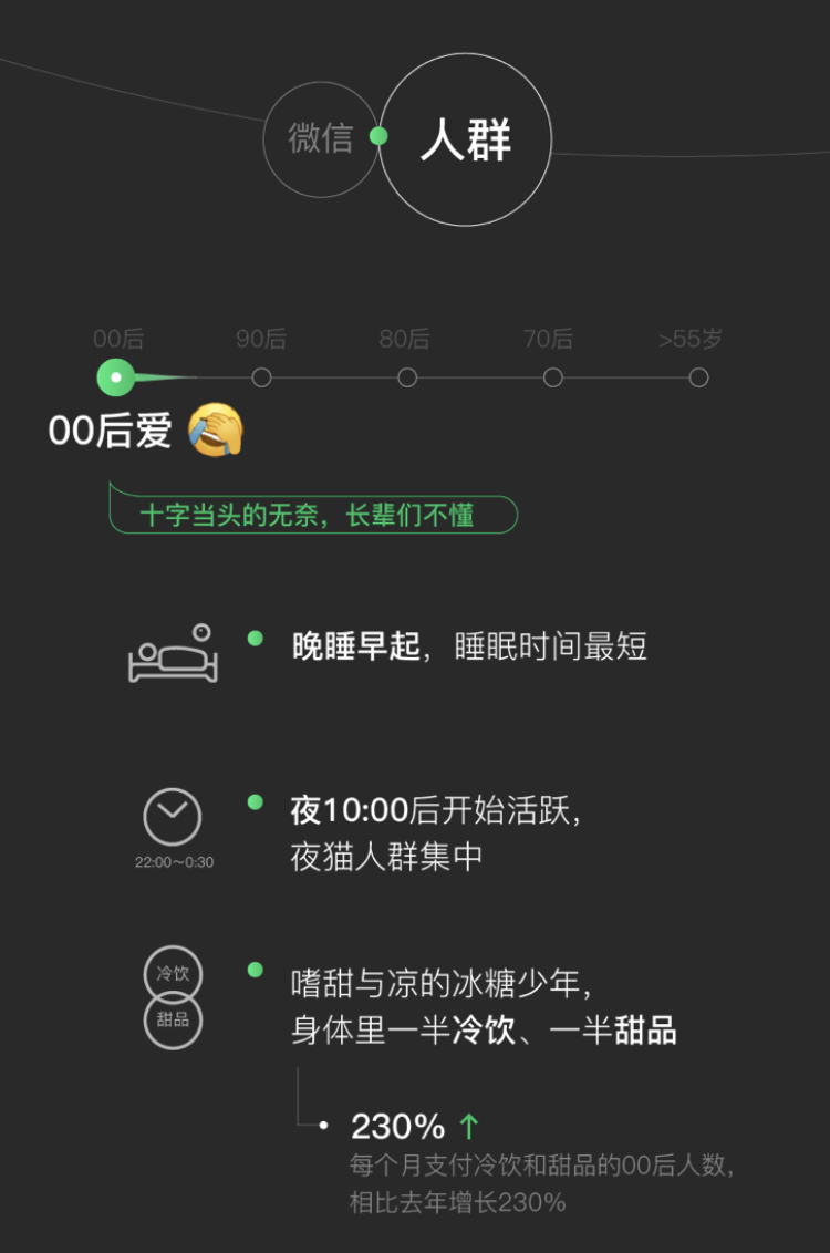 微信用戶畫像方面,00后最愛“捂臉“表情,他們晚睡晚起,睡眠時間最短,并在晚上10點后開始活躍。而且00后偏愛冷飲和甜品,每個月支付冷飲和甜品的00后人數,相比去年增長了230%。