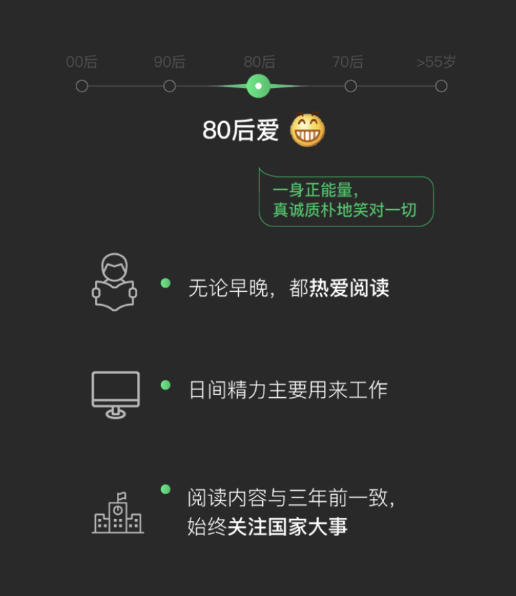 80后最愛的微信表情是“大笑”,他們最熱愛閱讀,日間精力主要用來工作,閱讀的內容與三年前一樣,始終關注國家大事。