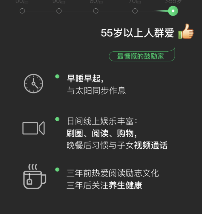 而55歲以上的人群最愛的表情是“點贊”,他們早睡早起,與太陽同步作息,平時線上娛樂非常豐富,包括刷圈、閱讀和購物,晚餐后習慣與子女視頻。三年前,他們熱愛閱讀勵志文化,現在則關注養生健康。