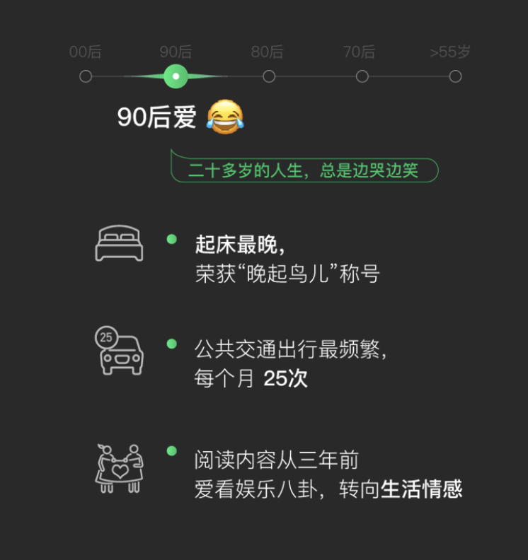 90后最愛的微信表情是“哭笑“,他們起床最晚,公共交通出行最頻繁,平均每個月25次。閱讀內容也從三年前的愛看娛樂八卦轉向生活情感。