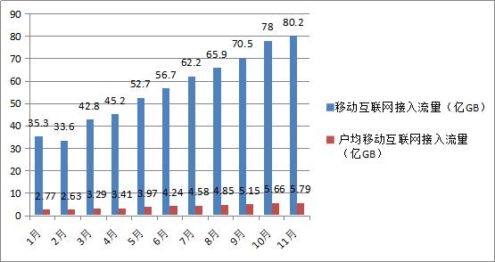 2018年運營商在移動和寬帶用戶的增長均超出預期,在龐大的用戶基數上繼續實現了快速的增長,通信資費的下降有效地刺激了用戶對通信服務需求,移動業務流量用量增長近200%。工信部公布的數據顯示,1-11月,移動互聯網累計流量達624億GB,同比增長194.3%,11月當月DOU(戶均移動互聯網接入流量)達到5.79GB,同比增長142.3%。