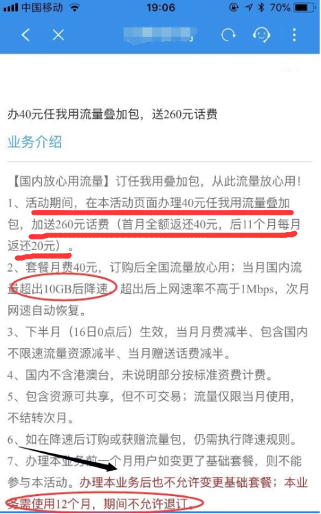 從圖中我們可以看到,這是一款叫做“任我用”的套餐,相信移動(dòng)的老用戶應(yīng)該都是清楚的。其實(shí)這款套餐并不是真正意義上的20元“不限流量”,而是有12個(gè)月的優(yōu)惠期,期間只需要20元每月,而優(yōu)惠到期后,就會(huì)恢復(fù)40元的原月費(fèi)。但套餐中依舊不變的就是“無限流量”了,不過采用的卻是最低的限速閥,每個(gè)月使用超過10G之后就會(huì)限速至1Mbps,看到這,不少網(wǎng)友表示:“移動(dòng)終于良心了嗎?”
