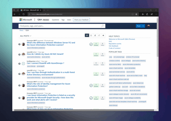 微軟宣布,將會砍掉MSDN和TechNet論壇,將用新的Microsoft Q&A(問題與解答)代替。Microsoft Q&A將會是獲得有關微軟產品和服務的所有問題答案的唯一途徑。Microsoft Q&A算是Microsoft Docs平臺的擴展,它將使用相同的用戶身份驗證。
