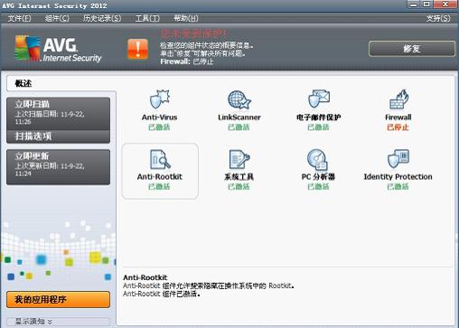 在AVG 2012的主頁我們可以看到有幾大功能模塊,Anti-Virus是查殺病毒模塊,LinkScanner主要提供上網保護功能,電子郵件保護可檢查郵件中病毒。Firewall是防火墻模塊,用于控制通過每個網絡端口傳輸的通信內容,防止受到攻擊。系統工具模塊可查看進程、瀏覽器插件和網絡連接等等。