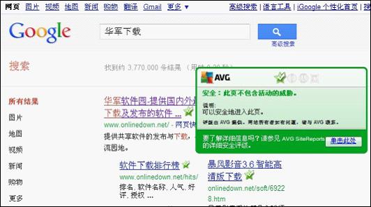 圖中搜索結果后出現的對號表示AVG已經對搜索鏈接進行安全設置,經小編測試此功能可以在IE瀏覽器的百度、谷歌、必應、雅虎搜索結果中顯示。